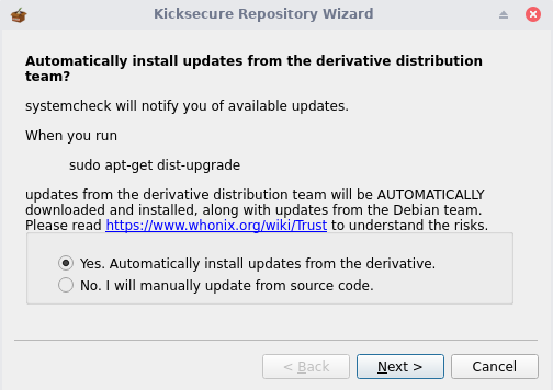However, the Kicksecure testers APT repository is updated every… It’s not really planned… Once the developers repository seems “stable” and it has been a while, I move the packages to the testers repository. You can learn more on how to enable the testers repository here: